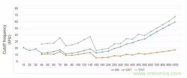 這張圖給出了不同頻率下共模和差模濾波器轉(zhuǎn)折頻率的關(guān)系,可以看出,一些低頻點EMI濾波器體現(xiàn)出了非常好的特性。例如70Khz,140Khz。而這兩個開關(guān)頻率是工業(yè)界常用的兩個開關(guān)頻率,非常討巧,因為EMI噪聲測試是150KHz到30MHz。不過這個也與拓撲有關(guān)。