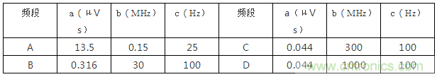 表3的含義是:在A、B、C、D各頻段內(nèi),分別輸入各自的標(biāo)準(zhǔn)周期脈沖,要求脈沖的幅度×寬度等于a(μVs),重復(fù)頻率為c(Hz),該周期脈沖的頻譜至少應(yīng)該在b(MHz)以下是均勻的,脈沖信號發(fā)生器的源阻抗應(yīng)和騷擾測量儀輸入阻抗相等。對于該輸人信號,騷擾測量儀在該頻段的任何頻率上的讀數(shù)都應(yīng)該等于60dB(μV)。