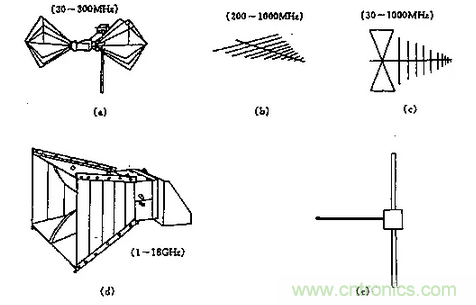 (a) 雙錐天線 (b)對數(shù)周期天線 (c)混合寬帶天線 (d)喇叭天線 (e)對稱振子天線