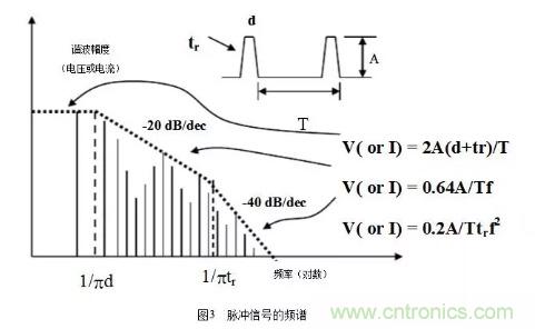 在EMC中,除了基本頻率外,還需考慮諧波因素,通常取十倍頻,但在數(shù)字電路中卻有些不同,比如在時鐘電路和邏輯門電路中,輻射帶寬與數(shù)字信號的上升沿或下降沿有關(guān)系,而不是數(shù)字信號的重復(fù)周期,其關(guān)系為:rtF?/1max?,其中rt是脈沖的上升沿時間。例如,典型時鐘驅(qū)動的邊沿速率是2ns,此時,maxF≈160MHz,再考慮十倍頻,則此時鐘電路可能產(chǎn)生直到1.6GHz的輻射帶寬。所以在選擇器件時要選擇慢速的邏輯器件系列,因為器件對電磁輻射貢獻的大小與工作頻率無直接關(guān)系而只取決于邊沿速率(這和從電路功能設(shè)計上選擇快速器件是矛盾的,在電路設(shè)計時需要折中考慮)。還有從器件的抗擾能力上來說,CMOS器件是最好的,因為它的噪聲容限高。從封裝上來說,BGA是最好的,因為它的引線很短。脈沖信號的頻譜如圖3所示。