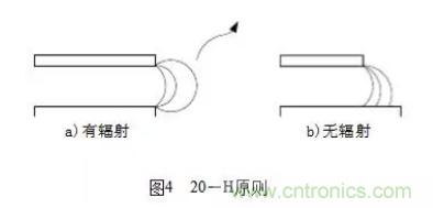 (1)20-H原則,決定印制線條間的距離,表述如下:所有的具有一定電壓的PCB都會向空間輻射電磁能量(如圖4a),為減小這個效應(yīng),PCB的物理尺寸都應(yīng)該比最靠近的接地板的物理尺寸小20H(其中H是兩層PCB的間距),即3mm左右,這樣可使輻射強度下降70%(如圖4b)。20-H原則示意圖如圖4所示: