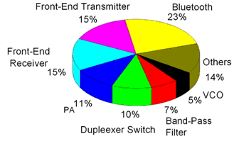 LTCC器件按其所包含的元件數(shù)量和在電路中的作用,大體可分為LTCC元件、LTCC功能器件、LTCC封裝基板和LTCC模塊基板。LTCC屬于高新科技的前沿產(chǎn)品,廣泛應(yīng)用于微電子工業(yè)的各個領(lǐng)域,具有十分廣闊的應(yīng)用市場和發(fā)展前景。目前LTCC 技術(shù)已經(jīng)進(jìn)入更新的應(yīng)用階段,包括無線區(qū)域網(wǎng)絡(luò)、地面數(shù)位廣播、全球定位系統(tǒng)接收器組件、數(shù)位信號處理器和記憶體等及其他電源供應(yīng)組件甚至是數(shù)位電路組件基板。例如,村田、三菱電工、京瓷、TDK、Epcos、日立、Avx等十多家開發(fā)的手機(jī)無線開關(guān)組件,NEC、村田和和易利信等開發(fā)的藍(lán)牙組件都是由LTCC技術(shù)制成的。此外,LTCC組件因其結(jié)構(gòu)緊湊,高耐熱和耐沖擊性,目前在軍工和航天設(shè)備中廣泛應(yīng)用,預(yù)計未來在汽車電子系統(tǒng)上的應(yīng)用也會非常普遍。CTS 公司已經(jīng)宣布將為汽車電子市場提供低溫?zé)Y(jié)陶瓷(LTCC)電路板。圖6為目前LTCC器件應(yīng)用領(lǐng)域所占比例。
