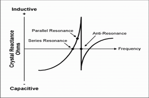 晶體具有兩種諧振模式:串聯(lián)(兩個(gè)頻率中的低頻率)和并聯(lián)(反諧振,兩個(gè)頻率中的高頻率)。所有在振蕩電路中呈現(xiàn)純阻性時(shí)的晶體都表現(xiàn)出兩種諧振模式。在串聯(lián)諧振模式中,動(dòng)態(tài)電容的容抗Cm、感抗Lm相等且極性相反,阻抗最小。在反諧振點(diǎn)。阻抗卻是最大的,電流是最小的。在振蕩器應(yīng)用中不使用反諧振點(diǎn)。