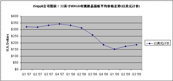 附圖所示為iSuppli公司對(duì)于2008年10月至2009年第四季度結(jié)束時(shí)32英寸WXGA TV LCD面板市場的價(jià)格預(yù)估。這種面板價(jià)格可以體現(xiàn)出整體市場趨勢。