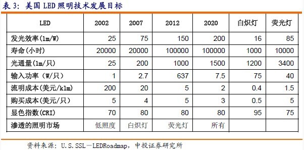 LED照明技術(shù)的發(fā)展目標(biāo)是:發(fā)光效率將分階段從2002年的25流明/瓦提高到2007年75流明/瓦、2010年的150流明/瓦和2020年的200流明/瓦,發(fā)光成本將從2002的200美元/千流明降低到2007年的20美元/千流明、2010年的5美元/千流明和2020年的2美元/千流明。