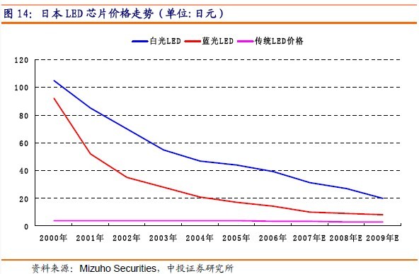 日本LED廠商供應(yīng)的白光LED價(jià)格已從2000年的每顆105日元(約1美元),下跌到2005年的44日元(不到0.5美元)、2009年的20日元;藍(lán)光LED價(jià)格從2000年的每顆92日元跌至2005年的17日元,預(yù)計(jì)2009年下降到8日元。預(yù)計(jì)2008年全年跌幅在10%左右。