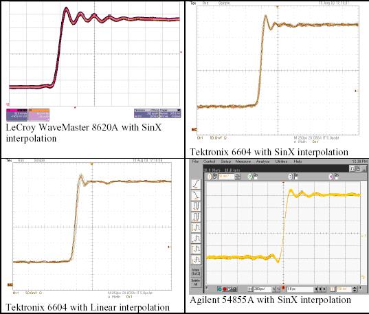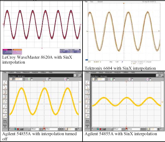 我們使用三種競爭的DSO進行簡單的試驗,其分別是力科Wavemaster 8620A、泰克6604和安捷倫54855A。這三種示波器的帶寬指標都是6 GHz,最大采樣率是20 GS/s。我們使用六種不同的信號和采樣率組合,說明SinX內(nèi)插算法的性能。