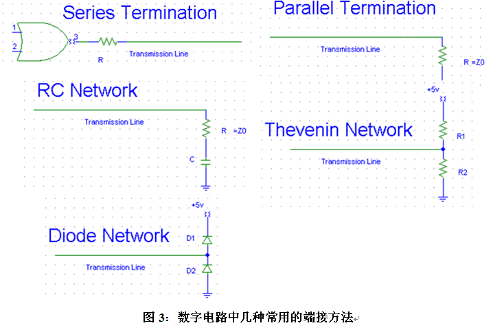 盡管并聯(lián)了100歐電阻后電路板能正常工作了,但是接收端測量到的峰峰值高達6.2V,對于SDRAM芯片3.3V的工作電壓來講還是比較大的,長期工作可能會導致內存芯片出問題,所以,我們還需改進端接策略。在信號完整性書籍中,通常有串聯(lián)匹配、并聯(lián)匹配、RC網絡、戴維南網絡等端接方法,如下圖3所示。相比并聯(lián)匹配,串聯(lián)匹配不用提供DC電流到地或者電源,不會對輸出的高低電平產生影響,能減小過沖和EMI,所以我們接著嘗試串聯(lián)匹配下的信號質量。