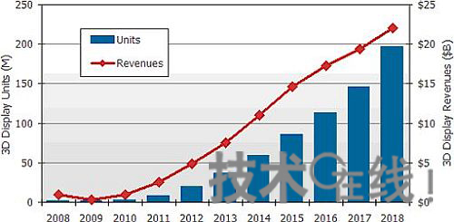 目前,3D(三維)顯示器非常引人注目。最新發(fā)布的《3D顯示器技術(shù)&市場(chǎng)調(diào)查報(bào)告》預(yù)測(cè),3D顯示器市場(chǎng)的供貨量和供貨金額將從2008年的70萬(wàn)臺(tái)、9億200萬(wàn)美元增長(zhǎng)至2018年的1億9600萬(wàn)臺(tái)、220億美元(圖1)。如果市場(chǎng)果真按照該預(yù)測(cè)增長(zhǎng)的話(huà),年均復(fù)合增長(zhǎng)率(CAGR)按金額計(jì)算將達(dá)到38%,按數(shù)量計(jì)算將達(dá)到75%。