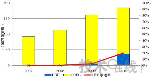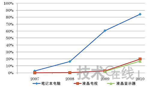 液晶顯示器配備LED背照燈的進展超過預期 筆記本電腦面板配備LED背照燈早于液晶電視面板,于2007年就全面開始了。2009年的LED背照燈配備比例達到了60%以上。預計2010年開始將全面向LED背照燈時代過渡。在2010年配備比例將達到80%以上,2012年之前將全面改用LED背照燈。