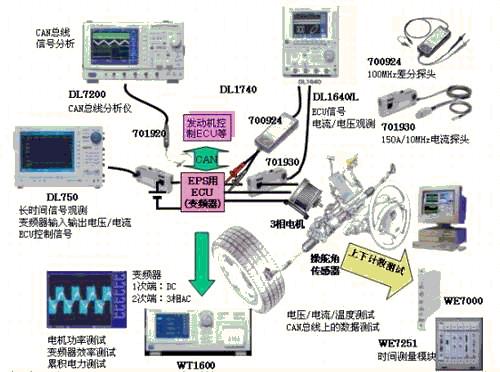 動力方向盤(EPS)在小型汽車中應(yīng)用已經(jīng)比較普及了,但在需大扭矩的大型車中應(yīng)用時需要采用3相電機(jī).不同于傳統(tǒng)的DC機(jī),測試3相交流電機(jī)需要功率計測試電力及效率.此外,ECU間采用CAN總線通信,還必須測試CAN總線信號。