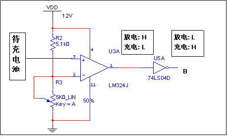可見,B點電位在放電狀態(tài)時為低電位,充電狀態(tài)時為高電位,與A點電位相同。由此我們將這兩點電位接入到與非門的輸入端。