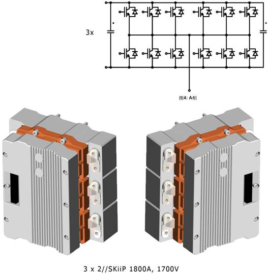 如果采用了更強(qiáng)大的SKiiP模塊,如使用氮化鋁作為陶瓷基板的SKiiP1.8kA,1.7kV,可從三相逆變器獲得更高的功率,即1800kVA。