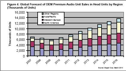 北美是車用高端音響系統(tǒng)的最大市場(chǎng)。該地區(qū)OEM高端音響單位出貨量預(yù)計(jì)到2016年將增長(zhǎng)到460萬套,而2007年是330萬。