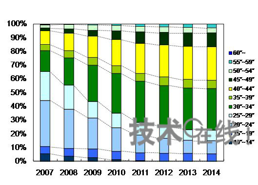 按屏幕尺寸劃分的電視供貨量展望(2010年以后為預測值)