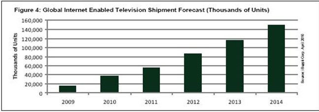 同樣,隨著品牌廠商努力延緩價(jià)格下跌速度和吸引消費(fèi)者來(lái)更換其原有的老式平板電視,未來(lái)幾年對(duì)于IETV的推廣活動(dòng)將會(huì)增強(qiáng)。iSuppli公司預(yù)測(cè),2014年IETV市場(chǎng)將從2009年的1470萬(wàn)臺(tái)增長(zhǎng)到1.49億臺(tái),復(fù)合年度增長(zhǎng)率為58.9%。