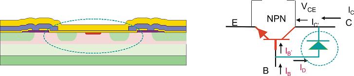 要在降低飽和電壓的基礎(chǔ)上縮短開關(guān)時間,關(guān)鍵是最大程度降低開關(guān)操作中晶體管的擴展電容。這主要通過集成寄生的鉗位結(jié)構(gòu)(圖3)來實現(xiàn),該設(shè)計可以避免過驅(qū)動處于飽和狀態(tài)的晶體管,能夠有效降低晶體管的存儲時間ts。
