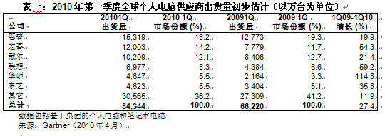 據(jù)Gartner發(fā)布的初步統(tǒng)計(jì)結(jié)果,2010年第一季度全球個(gè)人電腦出貨量已達(dá)到8,430萬臺,與2009年同期相比增長27.4%,這一結(jié)果超過了Gartner此前所作的22%的增長預(yù)測。