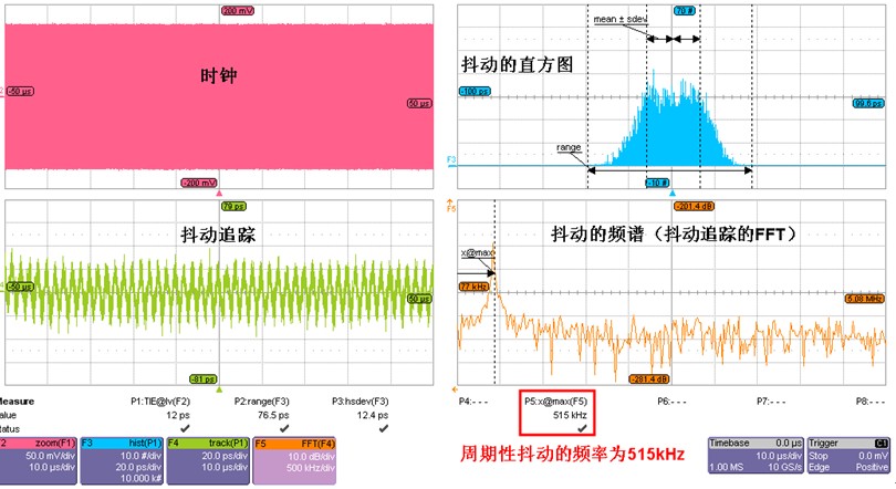 如下圖5為某100MHz時(shí)鐘在時(shí)域、頻域、統(tǒng)計(jì)域分析其TIE抖動(dòng)的示意圖。左上角的F2為某100MHz時(shí)鐘,P1是時(shí)鐘的TIE參數(shù)測(cè)量;右上角的F3是TIE抖動(dòng)的直方圖,直方圖不是高斯分布,可見(jiàn)時(shí)鐘存在固有抖動(dòng)。