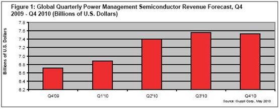 2010年第一季度,電源管理半導(dǎo)體銷售收入達(dá)到69億美元,比2009年第四季度的67億美元增長(zhǎng)2.9%。該市場(chǎng)在2009年第三季度曾陷入停滯,第四季度開始擴(kuò)張,第一季度數(shù)據(jù)顯示該市場(chǎng)仍在擴(kuò)張。