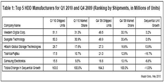 據(jù)iSuppli公司,西部數(shù)據(jù)在2010年第一季度硬盤出貨量最多,季度出貨量首次超過希捷,結(jié)束了長期屈居第二的局面。