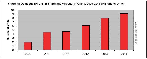 2010年中國(guó)市場(chǎng)IPTV-STB出貨量將比2009年大增136.8%,從190萬(wàn)臺(tái)上升到450萬(wàn)臺(tái)。iSuppli公司的圖表顯示,該市場(chǎng)在隨后的四年將繼續(xù)擴(kuò)張,到2014年底增長(zhǎng)率將為33%。由于國(guó)內(nèi)市場(chǎng)的潛在規(guī)模龐大,以及出口市場(chǎng)持續(xù)增長(zhǎng),中國(guó)可能成為全球最大的IPTV-STB制造基地。利用IPTV-STB,數(shù)字電視服務(wù)就能通過(guò)互聯(lián)網(wǎng)和寬帶網(wǎng)絡(luò)傳送。