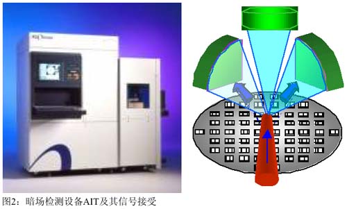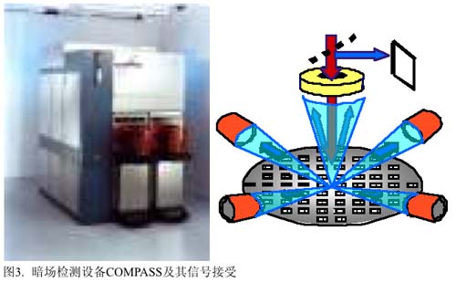 暗場檢測技術(shù)作為檢測晶片缺陷的有效手段之一,其優(yōu)點(diǎn)在于以下幾個(gè)方面:首先,在暗場獲得圖像的灰階易于控制和調(diào)節(jié)。暗場是位于硅片上方和硅片成30度角的區(qū)域,在此區(qū)域內(nèi)獲得的圖像灰階,可以通過調(diào)節(jié)激光的能量和探測器的敏感度來輕松控制;其次,在暗場內(nèi),可以很容易地辨認(rèn)有具體形態(tài)和位于硅片表面的缺陷,比如刮傷、微粒之類的缺陷;最后,使用暗場的檢測速度非??欤杀鞠鄬?duì)比較低,通常被用作快速分析影響產(chǎn)量的各類缺陷超出界定值的問題,AIT和COMPASS是在半導(dǎo)體制造企業(yè)廣泛應(yīng)用的暗場檢測設(shè)備(如圖2和3所示)。[page]