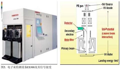 首先,它擺脫了照明光源,檢測結(jié)果不會(huì)受到類似變色、厚度不均等各種層面所帶來的物理因素的影響;其次,電子束的分辨率極高。因?yàn)樗臋z測單位是電子,電子要比微波以及任何尺寸的顆?;蛉毕荻家〉枚?;再次,電子是帶有電性的電荷,所以它可以被用于分析材料的電性或電組織成分,這被稱作電壓對(duì)比度圖像,經(jīng)常被用于檢測類似開閉鎖等電子電路缺陷和通孔蝕刻不足等材料缺陷。電子束檢測設(shè)備一般有KLA-Tencor和HMI公司的Escan系列(如圖5所示)。