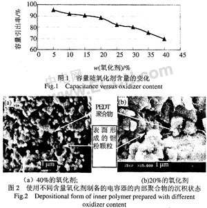 筆者重點(diǎn)討論了在用二步法制備聚合物電解質(zhì)的過程中氧化劑含量、聚合溫度等工藝條件對(duì)聚合物鉭電容器電容量C、介質(zhì)損耗和Res等電參數(shù)的影響。