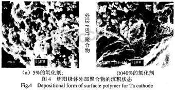 對(duì)于二步法生產(chǎn)工藝,單體為聚合反應(yīng)過程中的過量一方,聚合物生成的量由氧化劑的量來決定,聚合物在鉭芯表面的沉積數(shù)量隨氧化劑含量的增加而增加。從圖3可以看出,在相同的浸漬次數(shù)下,使用含量為5%的氧化劑陽極塊的質(zhì)量增加為0.54%,而使用含量為40%的氧化劑陽極塊質(zhì)量增加為3.52%,因此高含量的氧化劑可以有效增加聚合物的沉積量。