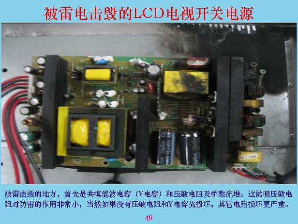 下面我們講一些具體的。這是一個(gè)開(kāi)關(guān)電源,開(kāi)關(guān)電源被雷劈的時(shí)候,輸入回路基本上都燒了,假如沒(méi)燒是什么樣的?可以看看,這是橋堆,這兩個(gè)是Y電容,這里面還有一個(gè)壓敏電阻。這是共模線圈,雷劈以后全部燒了,說(shuō)明壓敏電阻沒(méi)有起到什么保護(hù)作用,兩個(gè)電容都燒了,說(shuō)明電感相當(dāng)、相當(dāng)?shù)馗?。為了防止雷電,首先前面一定要加一個(gè)能量吸收,比較大的東西,成本相對(duì)來(lái)說(shuō)比較低,像試驗(yàn)站里面的放電裝置,那個(gè)東西沒(méi)有地方裝,也貴得很。在硬紙板上面排幾個(gè)鋸齒,中間隔一個(gè)頭就行了。如果中間隔6mm也可以。有一個(gè)一級(jí)電感,電感可以使瞬間上去很快的電壓降下來(lái),突然加一個(gè)1萬(wàn)伏、10萬(wàn)伏,加上去只有這兩端,另外兩端建立不起來(lái),所以剛加進(jìn)去的時(shí)候?qū)纂妬?lái)說(shuō),大部分能量都被吸收掉了。后面經(jīng)過(guò)這個(gè)以后,剩余部分通過(guò)共膜電容繼續(xù)吸收,吸收完以后還有差模部分,產(chǎn)生的差模部分通過(guò)電容把差模吸收掉。共模電容和差模電容具有抑制傳導(dǎo)干擾的作用,對(duì)雷電也有抑制作用,所以很多人也在問(wèn),電容接到前面好還是接在后面好?這個(gè)東西看你有什么作用,如果只是為了防EMI電磁干擾的話,接在越前面越好,接在測(cè)試儀表的輸入端最好,接到那里把信號(hào)全部短路掉了,就看不到了。但是對(duì)于雷電,你接到后面要好很多,所以這主要是防雷的,你就不要考慮電磁干擾和EMC了,盡量把兩個(gè)放在后面。