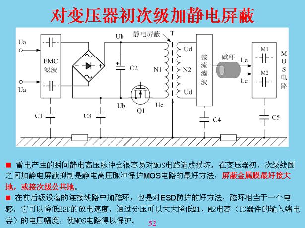 對(duì)于一些比較貴重的儀器、設(shè)備,在開(kāi)關(guān)電容電壓器這里最好做靜電比例,在初次級(jí)線圈中間做一個(gè)鋁箔片都可以,包一層,這層不能短路,短路的話變壓器就會(huì)燒掉,包在外面可以短路,包在里面不能短路,包在外面吸收漏電電感,包在里面的主回路里面會(huì)短路,然后把它進(jìn)行接地,這相當(dāng)于可以隔離掉。這個(gè)有一個(gè)教訓(xùn),前段時(shí)間康佳臺(tái)灣裝LCD屏測(cè)試,打了一個(gè)隔離變壓器,后面就是接測(cè)試儀表,每個(gè)月都有一臺(tái)、兩臺(tái)測(cè)試儀表?yè)p壞,查不出原因,最后讓他們把隔離變壓器的中間屏蔽才好。屏蔽以后,進(jìn)一步有機(jī)會(huì)的話,在接頭有連接的地方加一個(gè)磁環(huán),讓共模電壓將磁環(huán)速度放慢,緩沖一下,讓瞬間能量降低,瞬間能量緩慢一點(diǎn),慢慢的過(guò),損傷就會(huì)少很多。所有電路都可以把它看成一個(gè)分布電流,只要某地方電壓電位在改變,對(duì)后面都會(huì)產(chǎn)生充放電,從這上面理解就知道了,如果哪個(gè)地方構(gòu)成回路,如果有一個(gè)高電壓進(jìn)來(lái)一直傳導(dǎo)到后面,最后充電,充電可以理解成分布電容,如果沒(méi)有這個(gè)也有一個(gè)分布電容在里面,把分布電容放在這里,就比較形象地。就像以前的絕緣長(zhǎng)效濾管一樣,手一摸沒(méi)有造成回路也壞掉了,絕緣的濾管很容易壞,一從里面拿出來(lái),手一摸就壞掉,一個(gè)身上面帶正電,或者你作為天線有感應(yīng)電壓,感應(yīng)一下來(lái)回充放電就壞掉了。
