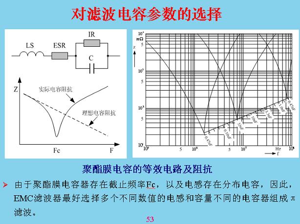 對(duì)于濾波電容,大家注意前面的EMC濾波,這個(gè)電容不是理想電容,里面有一個(gè)電感,還有漏電電阻,里面有串聯(lián)電阻,電感和電容有沒(méi)有產(chǎn)生串聯(lián)諧振?曲線是這樣一條斜線,串聯(lián)諧振相當(dāng)于把信號(hào)短路掉了,信號(hào)短路的阻礙很大,這里面有一個(gè)最佳值,然后成為感線,進(jìn)行EMC電路設(shè)計(jì)的時(shí)候最好用不同的電容進(jìn)行配模,這是0.4的曲線,33nF并聯(lián)就可以保證在上面不是好的,單獨(dú)一個(gè)電容后面覆蓋不到,以后有機(jī)會(huì)我講這些元器件,你們?cè)诖髮W(xué)里面學(xué)的是符號(hào),對(duì)電阻電容基本是不懂的,還有電組電容這方面的問(wèn)題最多,還有電容,電容來(lái)回極化的時(shí)候,速度跟不上外面的變化,會(huì)損耗相當(dāng)大,會(huì)燒壞,特別是脈壓電容,很多人認(rèn)為體積越小越好,但沒(méi)有考慮在開(kāi)關(guān)上容易出現(xiàn)問(wèn)題。