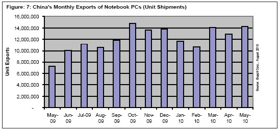 據(jù)iSuppli公司,由于第二季度全球?qū)P記本電腦的需求強(qiáng)勁,中國5月筆記本電腦出口量創(chuàng)下紀(jì)錄高位,幾乎是2009年5月的兩倍。