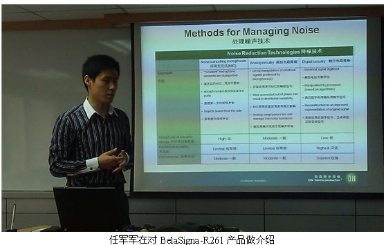 生活在都市的人們通常會在嘈雜的環(huán)境中撥打或接聽電話,人們總是希望能夠像在田野中一般獲得清晰并且沒有失真的聲音。對于手機廠商來講,采用能夠清晰拾取語音并抑制噪聲的解決方案是關(guān)鍵。為了應(yīng)對上述挑戰(zhàn),安森美半導(dǎo)體推出了高性能語音捕獲SoC方案BelaSigna-R261。安森美半導(dǎo)體音頻與助聽器中國市場開發(fā)經(jīng)理任軍軍在日前的產(chǎn)品發(fā)布會上對BelaSigna-R261的特性做了介紹,并現(xiàn)場對產(chǎn)品進行了演示。
