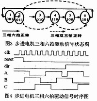 驅(qū)動(dòng)子程序主要負(fù)責(zé)生成步進(jìn)電機(jī)驅(qū)動(dòng)器所需要的信號(hào)。當(dāng)上行鍵或下行鍵按下,或者根據(jù)主程序運(yùn)行結(jié)果,需要提升或降落周轉(zhuǎn)箱托架,主程序會(huì)調(diào)用步進(jìn)電機(jī)驅(qū)動(dòng)子程序。步進(jìn)電機(jī)采用三相六拍工作方式,根據(jù)絲杠付螺紋間距,計(jì)算出步進(jìn)電機(jī)每步進(jìn)程,再根據(jù)周轉(zhuǎn)箱板間距,確定不同工況下,步進(jìn)電機(jī)的正/反轉(zhuǎn)步數(shù),這些步數(shù)保存在各相應(yīng)存貯器里,供主程序調(diào)用驅(qū)動(dòng)子程序時(shí)使用。圖3和圖4分別為步進(jìn)電機(jī)三相六拍工作方式時(shí)驅(qū)動(dòng)信號(hào)的狀態(tài)圖和時(shí)序圖。