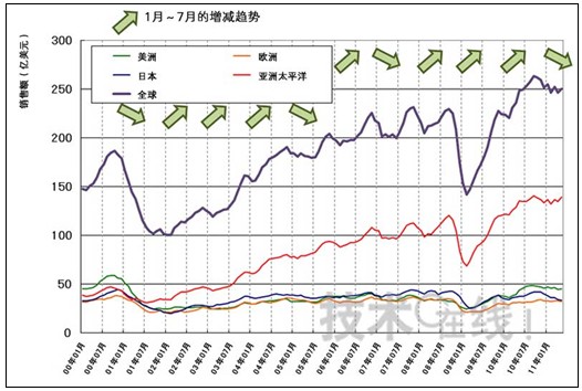 2011年1月份,全球半導(dǎo)體銷售額比上年同月增長14%,實(shí)現(xiàn)了開門紅。此后,銷售額與上月相比時(shí)增時(shí)減,而從稍長一點(diǎn)的時(shí)間區(qū)間來看,銷售額自2010年10月達(dá)到頂峰以后一直在減少。從2001年以后每年上半年的增減趨勢來看,增長的年份居多。這意味著2011年出現(xiàn)了停滯和衰退。
