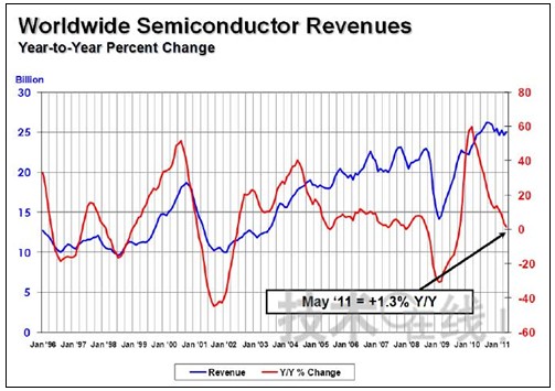 美國半導(dǎo)體工業(yè)協(xié)會發(fā)布的資料顯示,2011年5月份的全球半導(dǎo)體銷售額為250億300萬美元(3個(gè)月的移動平均值。下同)。比上年同月僅增長1.3%,與上個(gè)月相比,也只增長1.8%。