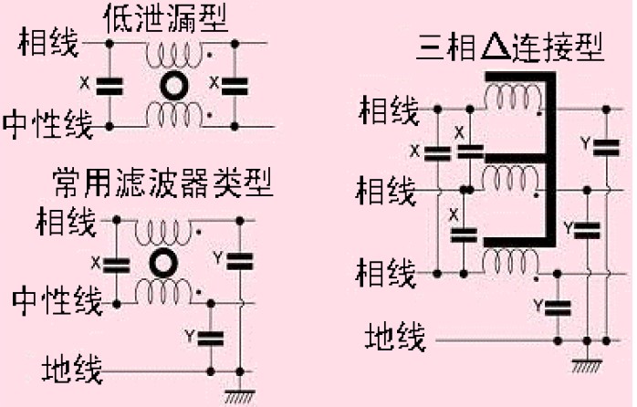 大多數(shù)電源線濾波器采用Y型電容,這些電容連接在相線與地線之間。為了不超過相關(guān)安全標(biāo)準(zhǔn)限定的地線允許泄漏值,這些電容的值大約在幾nF左右。一般地,Y電容應(yīng)連接到噪聲干擾較大的導(dǎo)線上(例如,儀表靈敏模擬電路中的電源線,開關(guān)電源中的整流器等)。