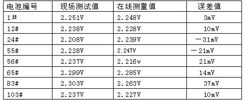 根據(jù)規(guī)程的要求,日常測量蓄電池端電壓采用是高精度4位半的數(shù)字萬用表,一般高精度萬用表蓄電池直流電壓檔測量精度為0.7%以上,絕大多數(shù)蓄電池在線裝置產(chǎn)品說明書上提到的測量精度達到了0.5%以上;顯示測量數(shù)值有些蓄電池在線裝置的測量端電壓數(shù)值為小數(shù)點后2位,與規(guī)程要求有較大誤差;有些裝置測量值雖可以到小數(shù)點后3位,但與實際用表測量數(shù)值相差較大。從運行情況看,端電壓在線監(jiān)測的誤差是隨機,每個數(shù)值偏差都不一致,而且偏差值隨著環(huán)境溫度、浮充電壓變化等而變化。表1為現(xiàn)場任意抽查幾個蓄電池浮充電壓,現(xiàn)場測試值與在線測量值的誤差情況,現(xiàn)場測試采用FLUK111數(shù)值萬用表直流檔測量精度0.7%,在線測量為許繼電源公司的WXJ-16型巡檢儀,測試環(huán)境溫度25℃。