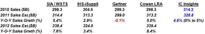 Cowan指出,在這5個最近發(fā)布的預(yù)測中,有3個都認(rèn)為2011年該市場的成長仍然會有3,132億~3,134億美元左右; Gartner 較悲觀,預(yù)估為2,990億美元;IC Insights 則樂觀地認(rèn)為會高于3,280億美元。