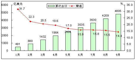 1-9月,電子信息產(chǎn)品進(jìn)出口總額達(dá)到8280億美元,同比增長(zhǎng)13.7%;其中,出口4805億美元,同比增長(zhǎng)14.4%,占全國(guó)外貿(mào)出口的34.5%;進(jìn)口3475億美元,同比增長(zhǎng)12.7%,占全國(guó)外貿(mào)進(jìn)口的27.0%。與上半年相比,出口和進(jìn)口增速分別回落1.4和2.6個(gè)百分點(diǎn)。