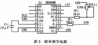 圖3為頻率調(diào)節(jié)電路。通過調(diào)節(jié)CD4046外接電位器POTll,控制VCO輸出脈沖的頻率,根據(jù)設(shè)計要求,該電路將輸出一個變化范圍在1~6 kHz之間的脈沖信號PLS,將該信號作為CPLD的輸入信號。在CPLD內(nèi)部通過計數(shù)延時和占空比設(shè)計要求,最終輸出一個頻率在400~3 000 Hz之間符合占空比要求的逆變觸發(fā)信號,并可通過POT11調(diào)節(jié)該信號的頻率。