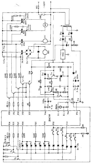 全自動(dòng)洗衣機(jī)由洗衣系統(tǒng)和控制電路組成。其控制電路分為機(jī)械和電腦型,電腦型控制電路是以單片機(jī)作為控制電路的核心。圖1給出單片機(jī)Z86C09組成的全自動(dòng)洗衣機(jī)的控制電路。