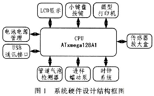 該系統(tǒng)是以ATxmegal28Al微處理器為核心,外圍連接有顯示、按鍵、打印機、傳感器放大盒、電源、通訊等模塊,其硬件設(shè)計結(jié)構(gòu)框圖如圖1所示。