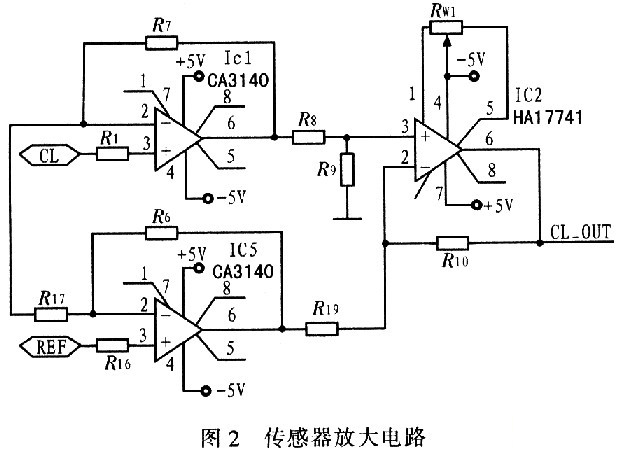 該分析儀的樣品液經(jīng)高分子膜傳感器測量后得到的電信號的幅度很小,在-250~250 mV之間,無法直接進行A/D轉(zhuǎn)換。因此,需要對這些模擬信號進行調(diào)理放大處理。在電路的設(shè)計上,為了與離子選擇電極的高內(nèi)阻相匹配,采用CA3140集成運算放大器作為一級放大,二級放大采用高精度低漂移的HAl7741運算放大器。