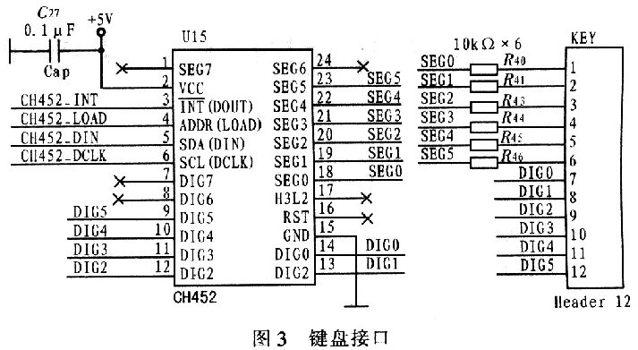 為便于用戶使用,該系統(tǒng)共36個按鍵,其中有26個英文字母按鍵、4個快速功能按鍵、4個方向按鍵以及確定和取消按鍵,這些按鍵制作成6x6的薄膜開關(guān)按鍵。所有按鍵均有CH452器件控制,這樣可降低主處理器的工作負(fù)擔(dān),大大簡化了軟件編寫程序。CH452內(nèi)置64鍵鍵盤控制器,基于8x8矩陣鍵盤掃描;內(nèi)置按鍵狀態(tài)輸入的下拉電阻;內(nèi)置去抖動電路;鍵盤中斷,可以選擇低電平有效輸出或者低電平脈沖輸出;提供按鍵釋放標(biāo)志位,可供查詢按鍵按下與釋放;支持按鍵喚醒,處于低功耗節(jié)電狀態(tài)中的CH452可以被部分按鍵喚醒。