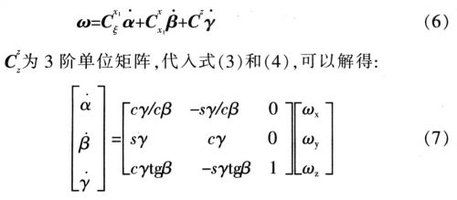 在對(duì)剛體的轉(zhuǎn)動(dòng)運(yùn)動(dòng)進(jìn)行解析描述時(shí).常應(yīng)用歐拉角或卡爾丹角??柕そ沁m用于姿態(tài)角變化較小的場(chǎng)合,因此.用卡爾丹角進(jìn)行描述。取初始時(shí)刻飛行體坐標(biāo)系Oξηζ為固定坐標(biāo)系,0xyz為與飛行體固結(jié)的動(dòng)坐標(biāo)系??柕そ沁x取的方法是,首先繞ξ軸轉(zhuǎn)過(guò)α角,到達(dá)0x1y1zl的位置;再繞y1軸轉(zhuǎn)動(dòng)β角,到達(dá)0x2y2z2的位置;再繞z2軸轉(zhuǎn)動(dòng)γ角,到達(dá)0xyz的位置。轉(zhuǎn)動(dòng)關(guān)系如圖l所示。