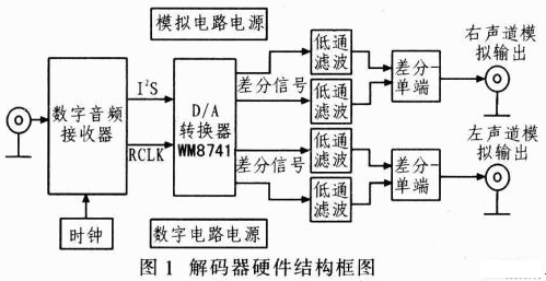圖1是該解碼器硬件結(jié)構(gòu)框圖,其中數(shù)字音頻接收器采用CirrusLogic公司的高速數(shù)字音頻接收器CS8416,該器件支持包括S/PDIF在內(nèi)的多種音頻輸入,取樣頻率范圍為32~192kHz。CS8416通過I2S接口與WM8741相連接。I2S總線只處理音頻數(shù)據(jù),其他控制信號必須單獨傳輸。CS8416的工作原理:接收器把接收到的S/PDIF格式的數(shù)字音頻數(shù)據(jù)進(jìn)行解碼轉(zhuǎn)換,同時重建音頻數(shù)據(jù)中的時鐘并提供給后續(xù)WM8741,音頻數(shù)據(jù)則通過I2S總線接口發(fā)送給WM8741。WM8741按照設(shè)定的參數(shù)完成數(shù)模轉(zhuǎn)換后,再以差分形式輸出左右通道的模擬音頻信號,并經(jīng)低通濾波器濾除高頻諧波噪聲,最終得到高質(zhì)量模擬電壓信號。如果輸出接口為RCA,還需將差分信號轉(zhuǎn)換為單端信號。