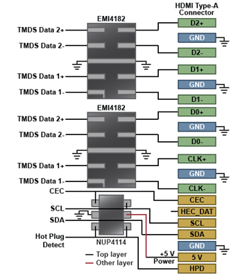 一種是四個(gè)高速對(duì)、多達(dá)6條額外接口線、低電容ESD +共模濾波器EMI4182,符合電容<0.5 pF和共模濾波要求,具有0.4 pF ESD保護(hù)、共模(CM)抑制(500 MHz為15 dB)、差模(DM)插入損耗(500 MHz為1.0 dB)、高速線路穿越型布線、業(yè)界領(lǐng)先的低鉗位電壓等特性。